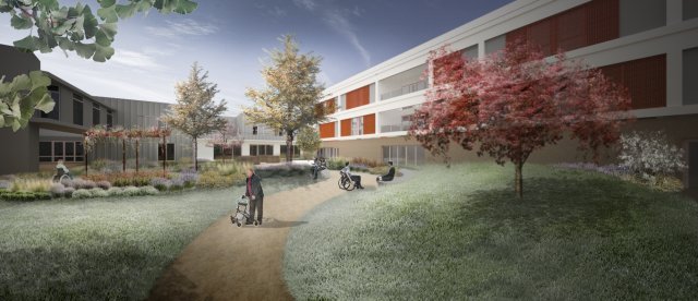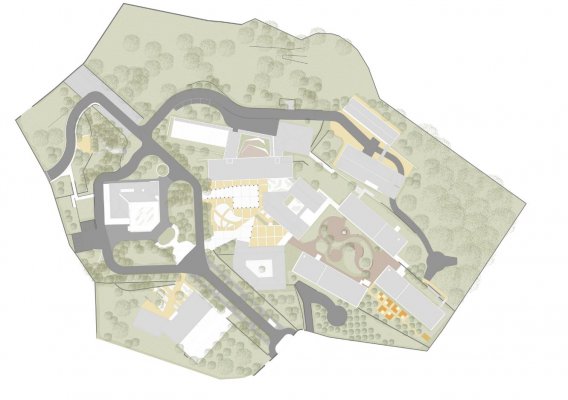 Associado aos diferentes edifícios que compõem o centro são propostas zonas verdes de enquadramento, contemplação e, especialmente, zonas de fruição. Estas zonas, pensadas e desenhadas para a realização de atividades ao ar livre, convidam ao envolvimento e participação dos utentes e residentes do centro, contribuindo assim para o equilíbrio e estimulação cognitiva.