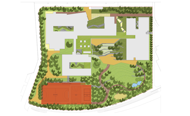 A linguagem de projecto adoptada prima pela desconstrução das linhas do desenho, procurando irreverência e contraponto à escala volumétrica do edifício. A grande expressão das zonas verdes nesta escola assume particular importância nesta estratégia, humanizando as zonas de estadia previstas.